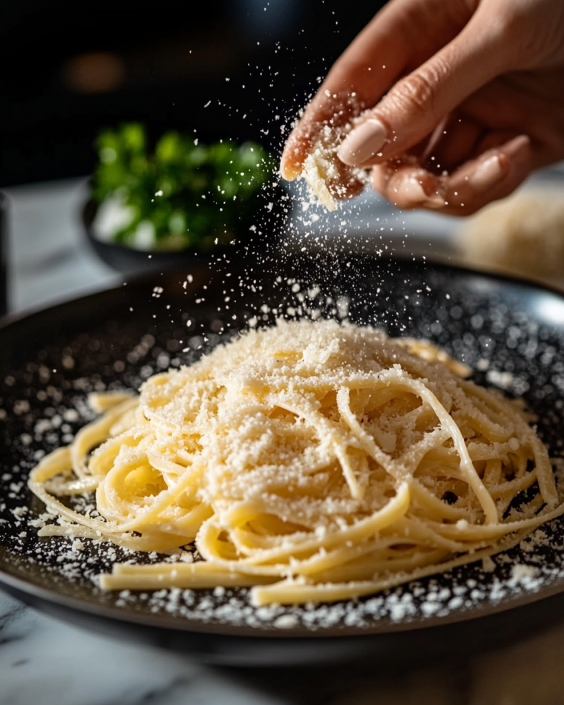 The Alfredo sauce is built from butter, garlic, heavy cream, and Parmesan cheese. Butter creates richness, while garlic adds a subtle aromatic depth without overpowering the sauce. Heavy cream gives the dish its silky texture, and Parmesan provides a salty, nutty finish that defines classic Alfredo.