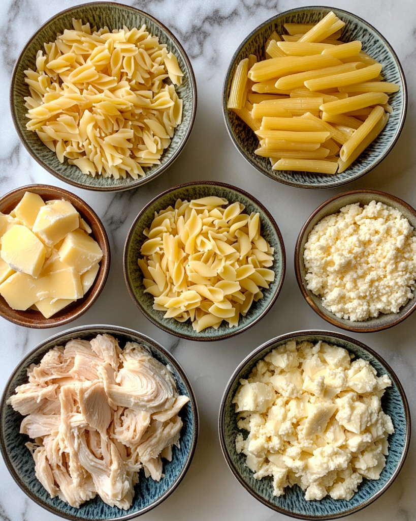 This casserole relies on a small group of familiar components that each play a specific role in texture and flavor. Cooked chicken provides a firm, protein-rich base that holds up well during baking. Pasta such as penne or rotini works well because its shape captures the sauce, allowing each bite to carry creamy coating.