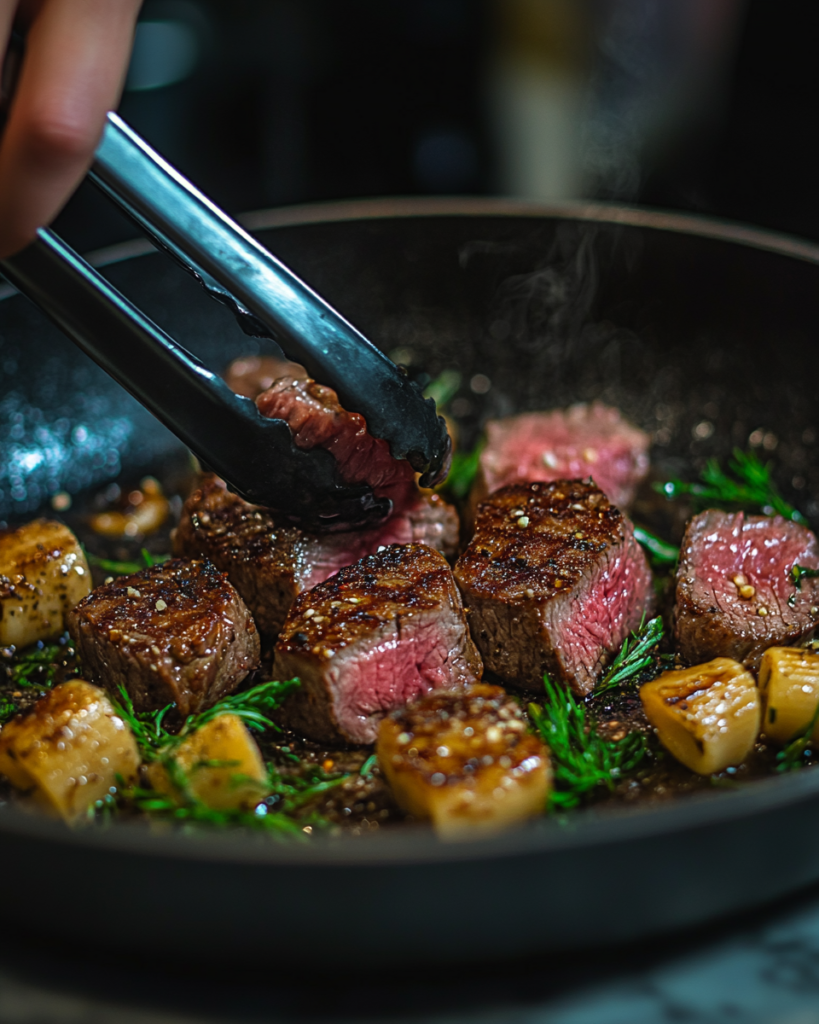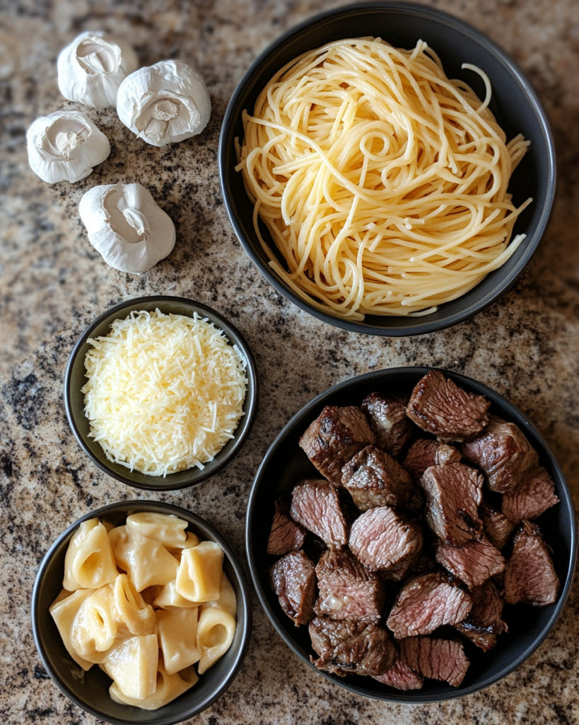 Seasonings like salt, black pepper, and a touch of Italian herbs help balance the richness. Olive oil is used to sear the steak, locking in flavor before it is added to the pasta.