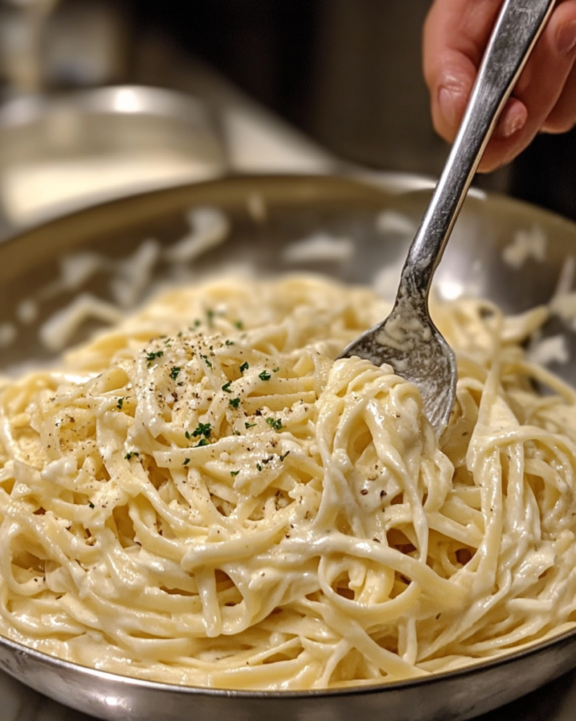 The sauce begins with butter and garlic, which form an aromatic base. Garlic softens in the butter, releasing a gentle depth that supports the cream without overpowering it. Heavy cream is then added to build the signature smooth texture that defines Alfredo-style pasta.