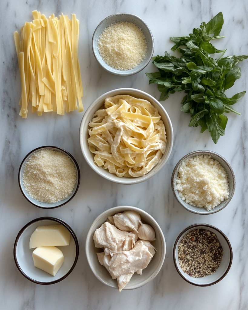 The foundation of Creamy Fettuccine Chicken Alfredo starts with a few key components: fettuccine pasta, chicken breast, butter, cream, and Parmesan cheese. Each ingredient contributes something important to the final dish, creating a balance of richness and texture.