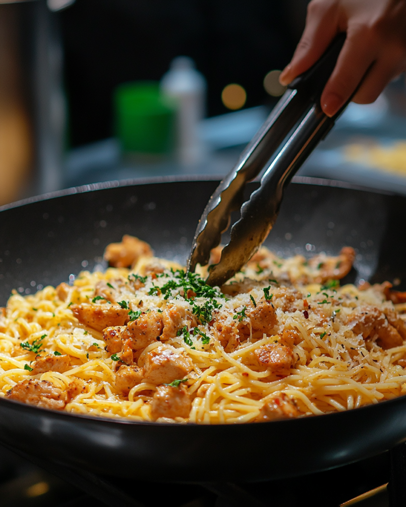 Return cooked chicken to the skillet and stir gently to coat each piece with sauce. Add cooked pasta and toss until every strand is covered evenly. If the sauce thickens excessively, a small amount of reserved pasta water can adjust the texture.