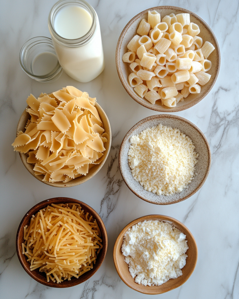 The beauty of easy cheese pasta lies in its short list of familiar ingredients. Each one plays a role in building the final texture and flavor, so choosing quality items makes a noticeable difference.