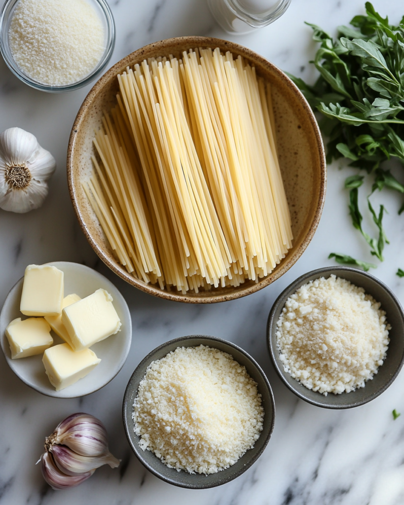 The foundation of this pasta relies on a small group of carefully balanced components. Garlic provides aromatic depth when gently cooked in butter, releasing a mellow flavor rather than sharp intensity. Butter forms the base fat that carries both garlic and cheese while also contributing to the smooth texture of the sauce.