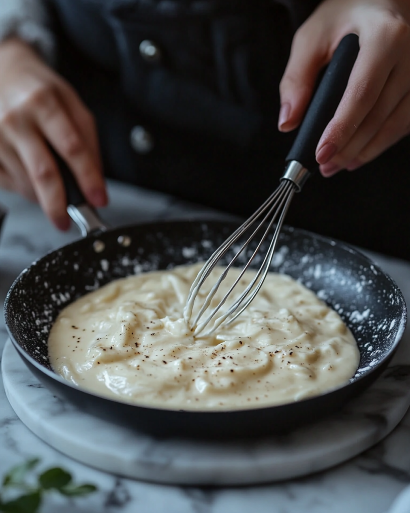 Slowly pour in milk while stirring. Continue mixing until the liquid becomes smooth and slightly thickened. Maintain steady heat to avoid lumps forming in the sauce.