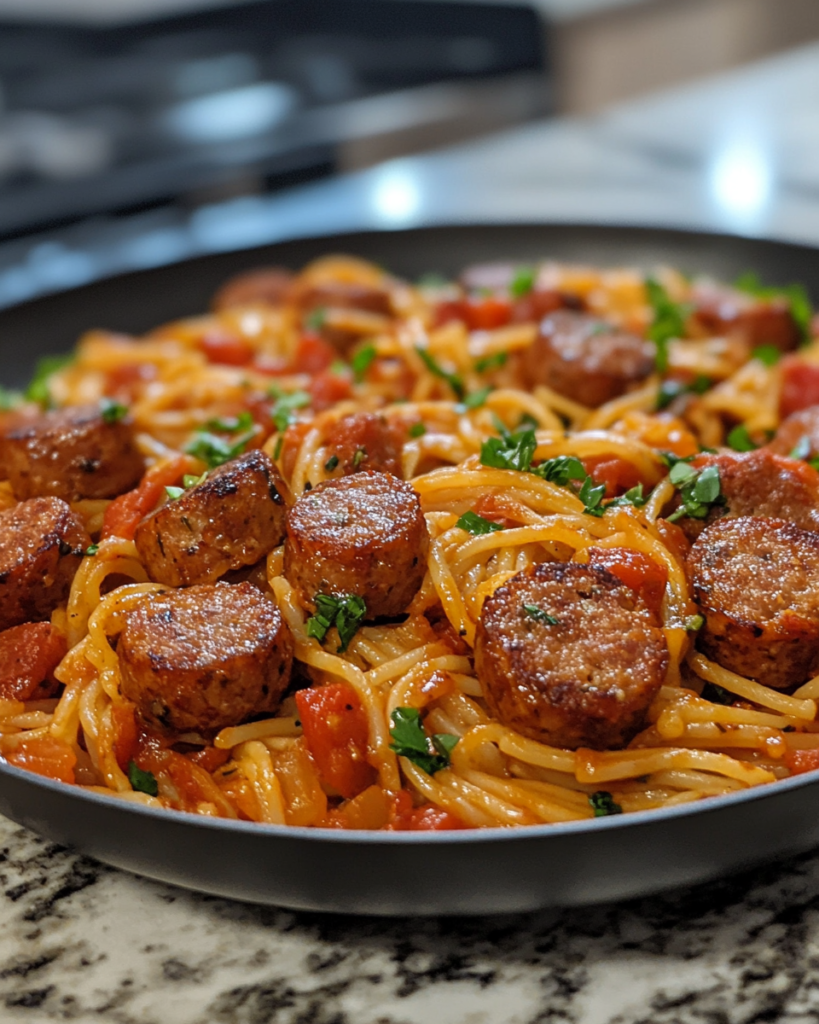 A sausage pasta skillet brings together pasta, seasoned sausage, and a savory tomato base in one pan. This dish centers on browned sausage pieces mingled with tender pasta, creating a unified skillet meal with rich depth and comforting aroma.