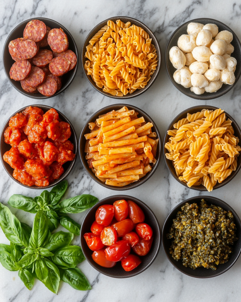 Pasta works as the structure of the dish. Short shapes such as penne or rotini hold sauce within their curves and ridges. These shapes also keep their firmness after simmering, which is important for skillet cooking where pasta finishes directly in sauce.