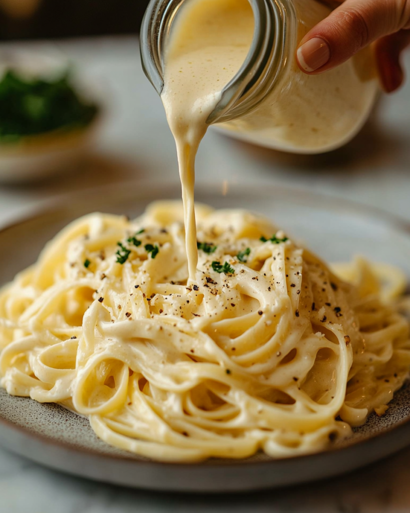 Heavy cream forms the base of the sauce, giving it body and smooth texture. When gently heated with butter, it creates a rich foundation that carries the flavor of garlic and cheese.