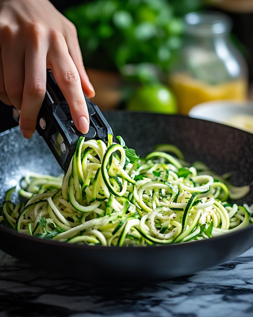Zucchini naturally contains a lot of water, so it’s important to remove excess moisture before cooking. Salting the spiralized zucchini and letting it sit for about 10 minutes helps draw out water. Patting it dry with paper towels is also essential. Cooking it briefly at the end—just a couple of minutes—prevents it from releasing too much liquid into the sauce.